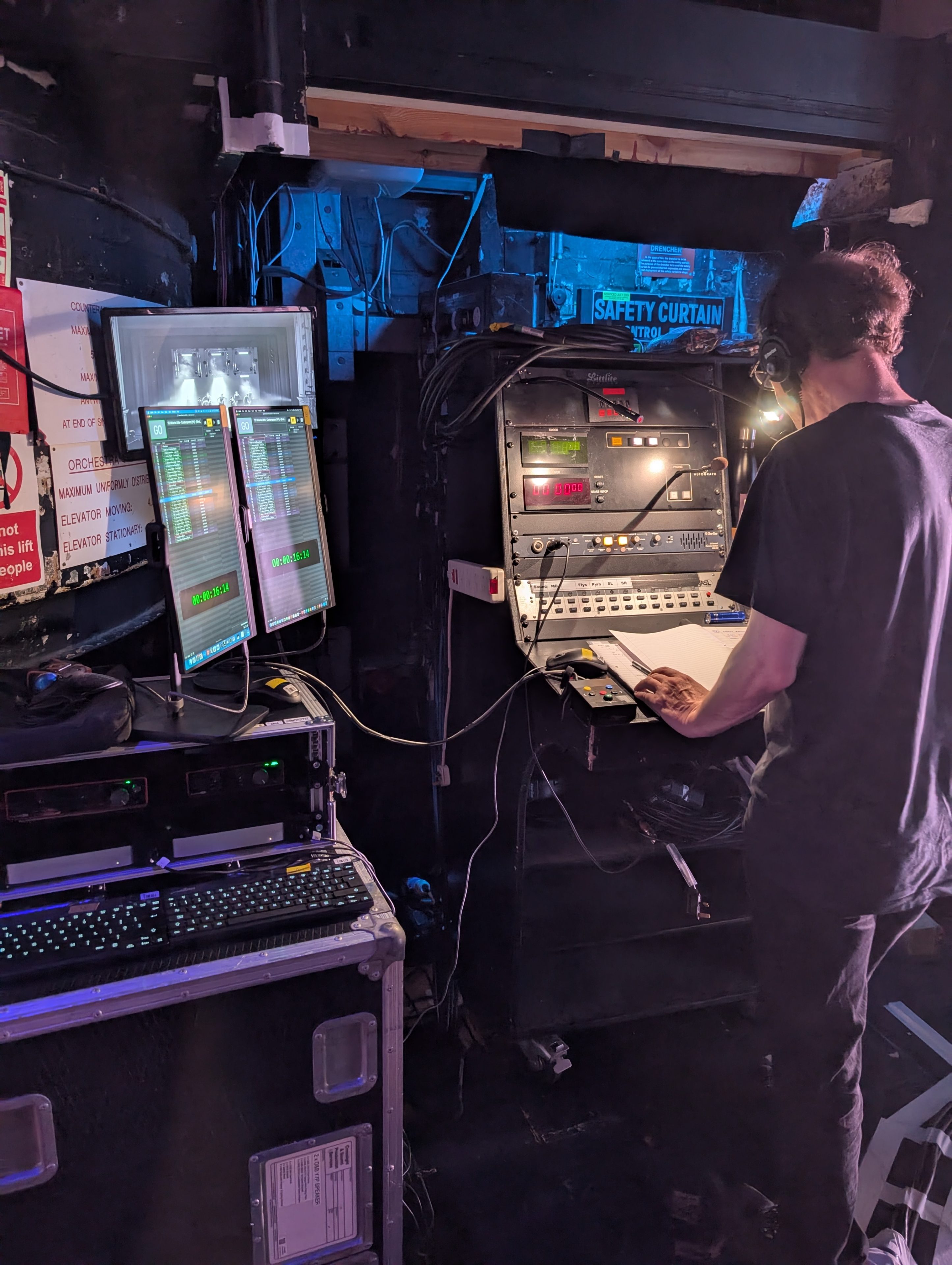 Here you can see Lizzie operating the Yamaha QL5 sound desk with Sonoros Radio Mic software running on a Macbook next to her. She is also screen sharing the playback system on stage to keep an eye on everything!